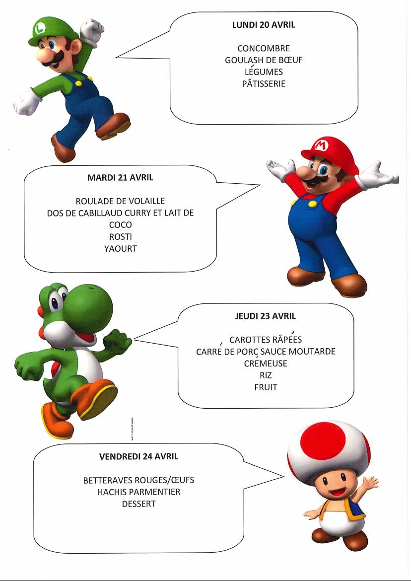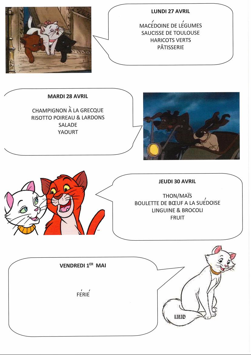 MENUS DU LUNDI 20 AVRIL AU VENDREDI 1er MAI 2026